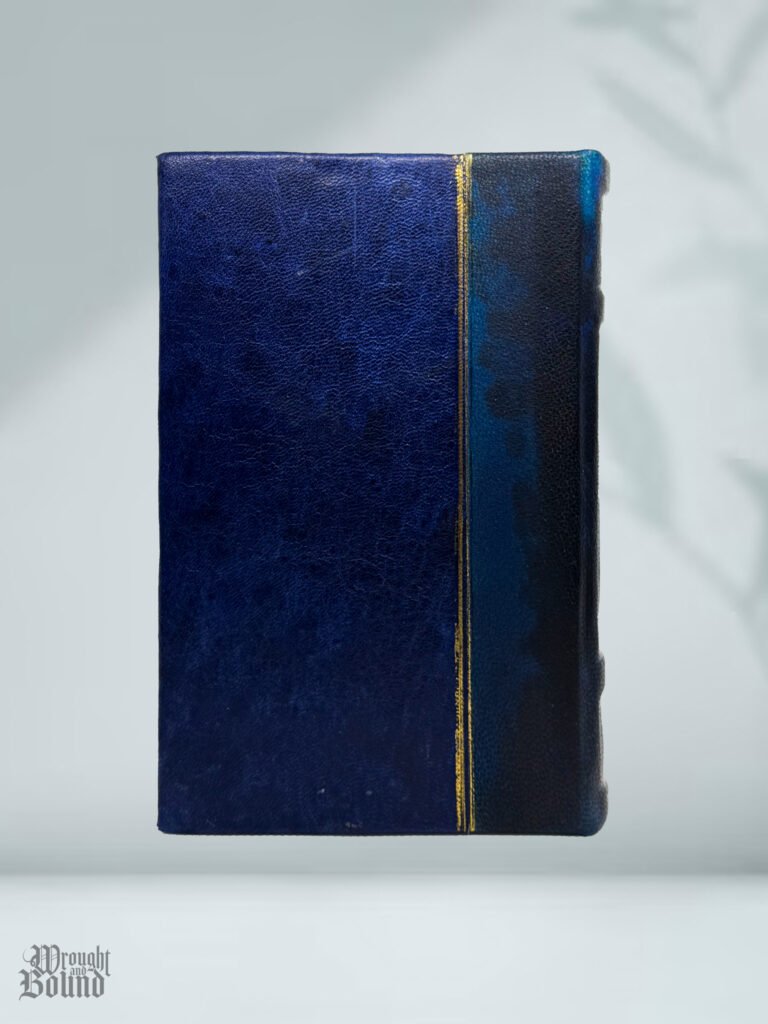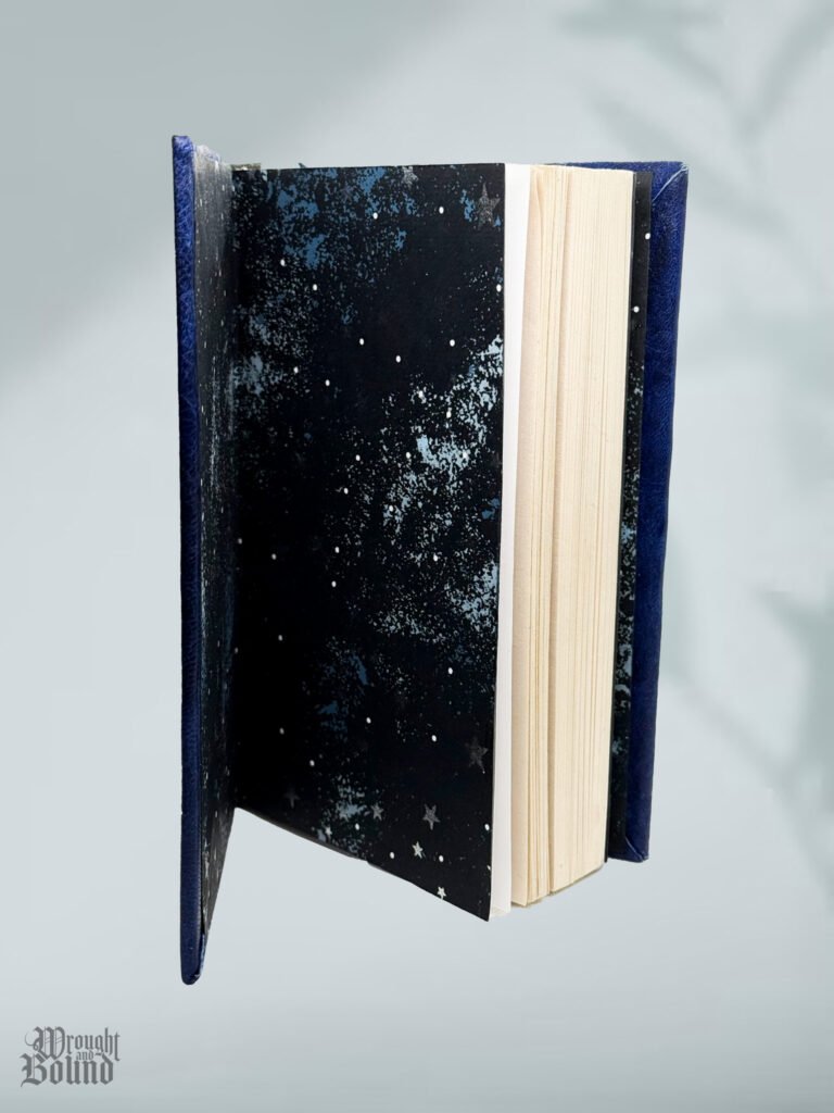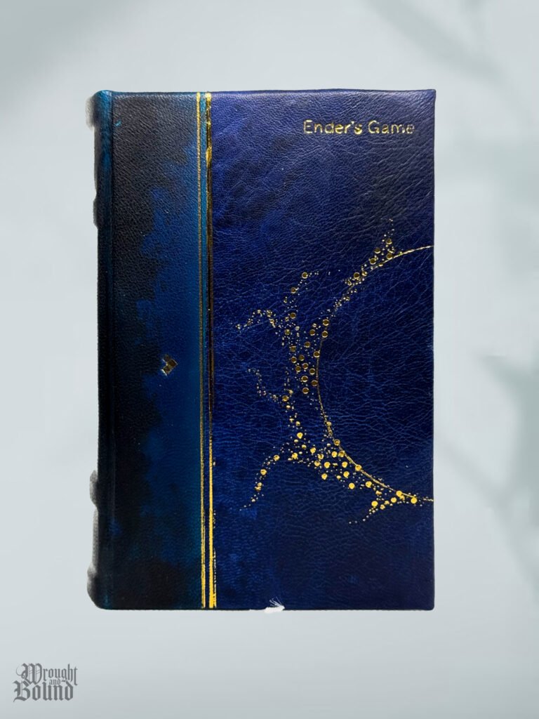 A rebinding of Ender’s Game by Orson Scott Card. Thrifted soft-cover copy disassembled by hand and recovered. Hand-died goat leather & mottled blue calf.
